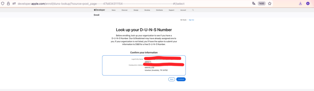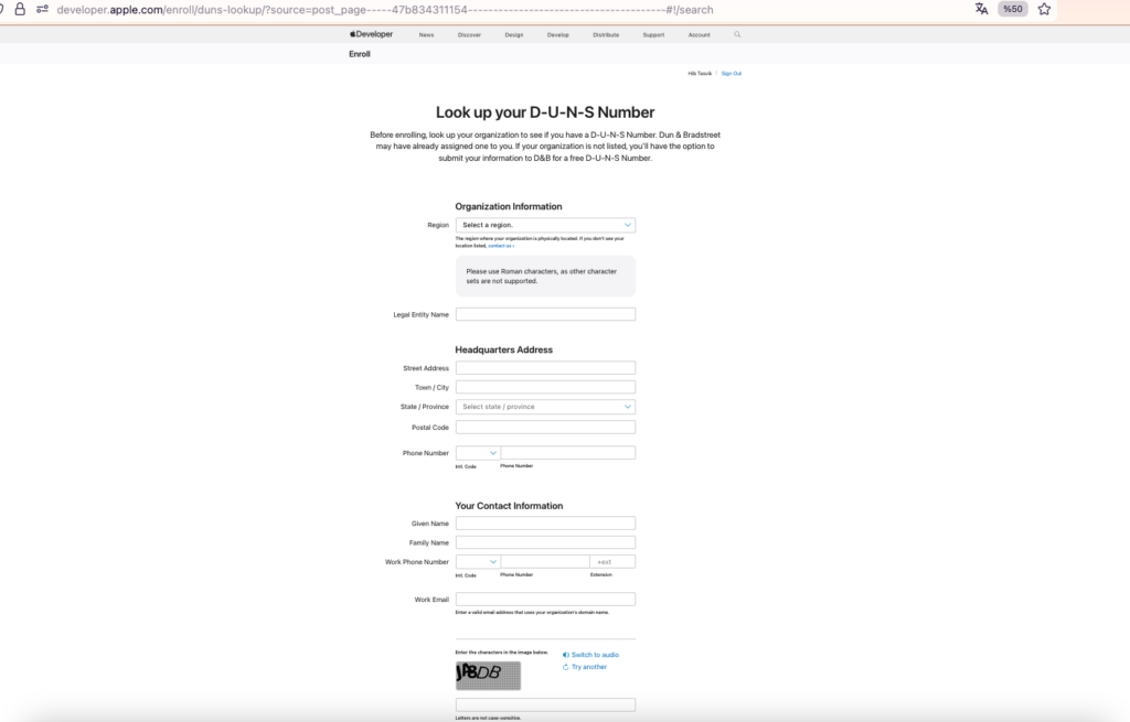 Öncelikle Apple hesabımızla giriş yapmamız gerekmektedir; developer hesabı olması şart değildir. Açılan sayfada şirket unvanı eksiksiz şekilde yazılmalı, iş telefonu ile cep telefonu aynı olsa da sorun oluşturmamaktadır. Formu doldurduktan sonra Apple bilgileri Dun & Bradstreet’e göndermekte ve sorguyu başlatmaktadır.