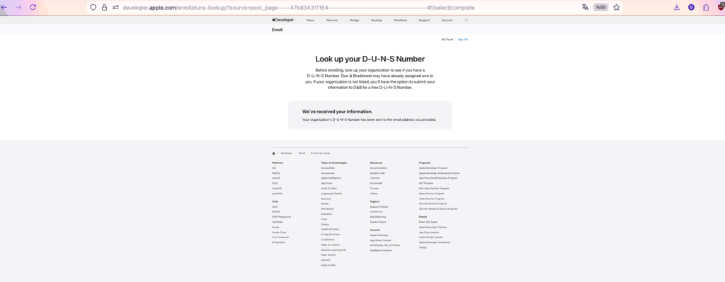 Biz DUNS’u Apple üzerinden alacağız; süreçteki en kritik nokta tam olarak budur. Aşağıdaki bağlantıya tıklayarak Apple’ın özel DUNS sorgu ekranına erişebiliriz: