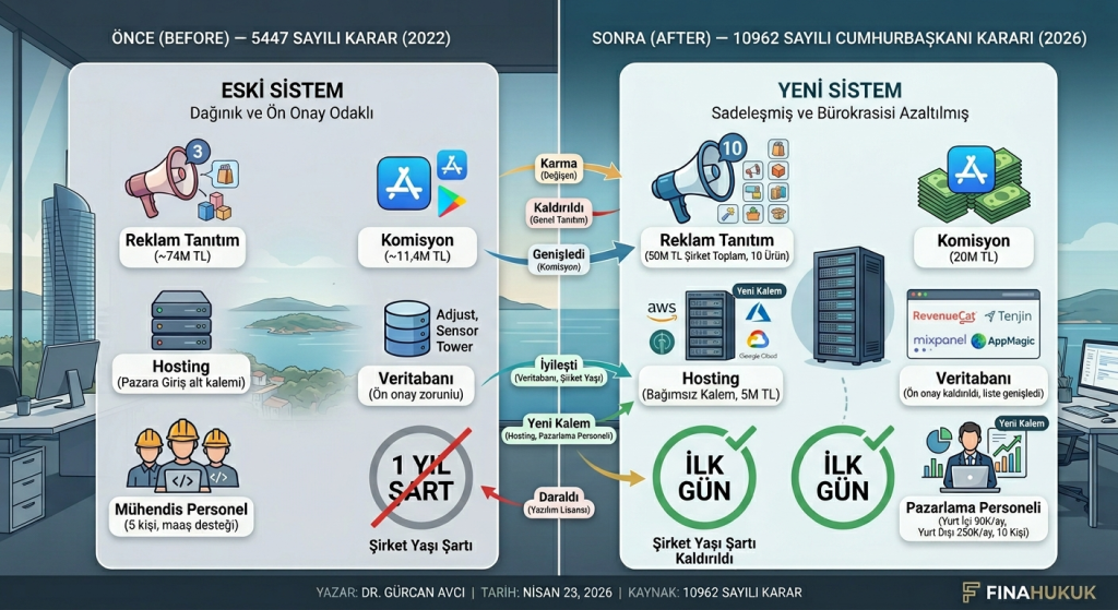 Aşağıda, mobil uygulama, oyun ve SaaS firmaları açısından önemli olan tüm destek kalemlerinin 2025 (eski) ve 2026 (yeni) hallerini kalem kalem karşılaştırıyoruz.